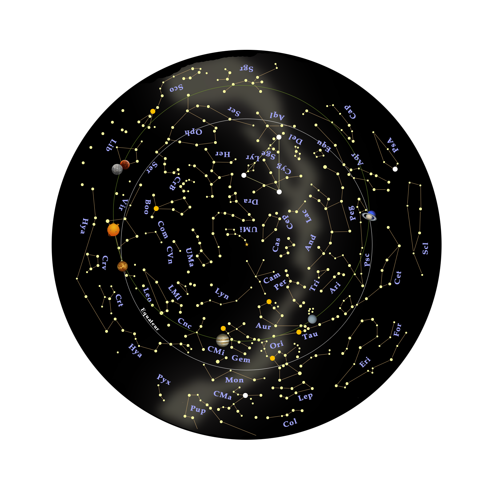 And - Andromeda - Andromède aql - Aquila - L'aigle Aqr - Aquarius- Le Verseau Ari - Aries - Le Bélier Aur - Auriga - Le Cocher Boo - Bootes - Le Bouvier Cam - Cameleopardalis - La Girafe Cap - Capricornus - Le Capricorne Cas - Cassiopeia - Cassiopée Cep - Cepheus - Céphée Cet - Cetus - La Baleine Cma - Canis Major - Le Grand Chien Cmi - Canis Minor - Le Petit Chien Cnc - Cancer - Le Cancer