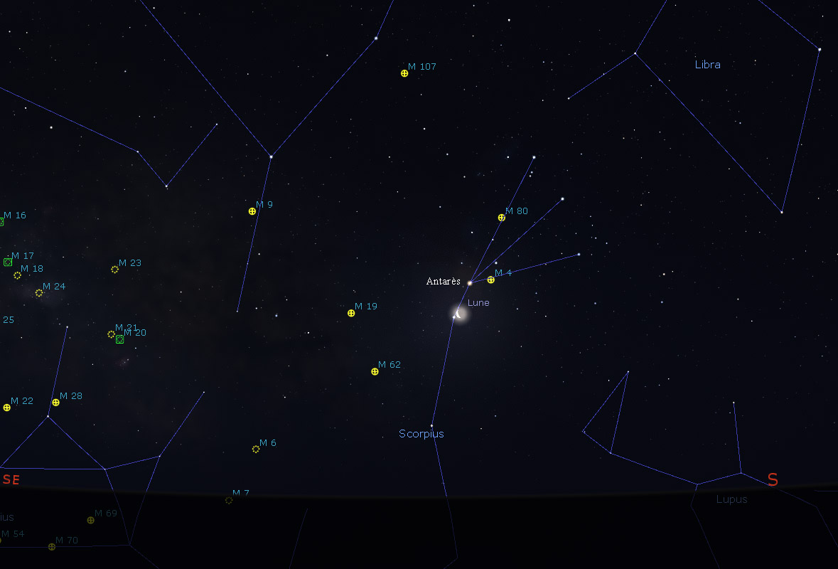 Un fin croissant de Lune sous Antarès, α du Scorpion le 11/02