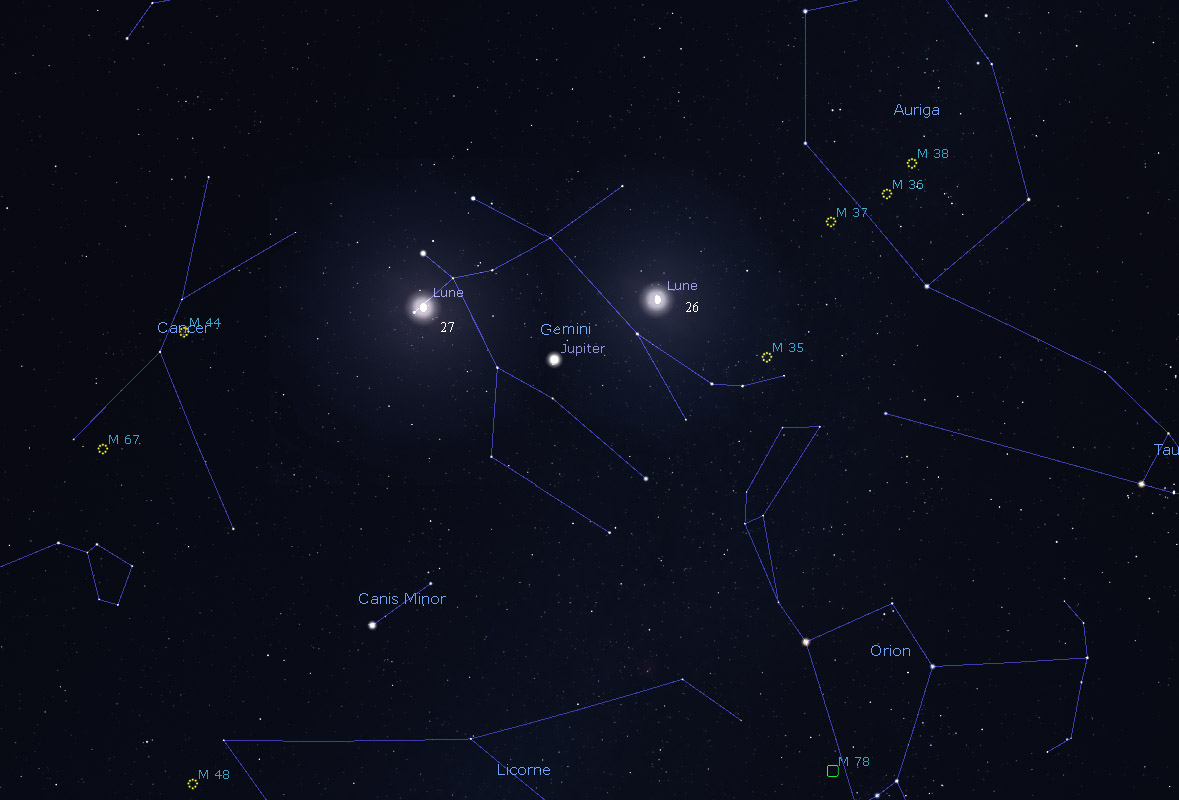 La Lune gibeuse et jupiter dans les Gémeaux les 26 & 27/02.