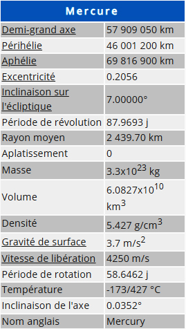 L'orbite de Mercure est particulière. C'est une ellipse excentrée et qui se déplace autour du Soleil. La période de révolution est de 87,969 j. Mercure possède un noyau liquide de 3600 km de diamètre. Celui-ci représente 61 % du volume de la planète, contre seulement 17 % pour celui de la Terre. Il est recouvert d’un manteau de 600 km environ, qui représente environ 20 % du rayon de cette planète. |