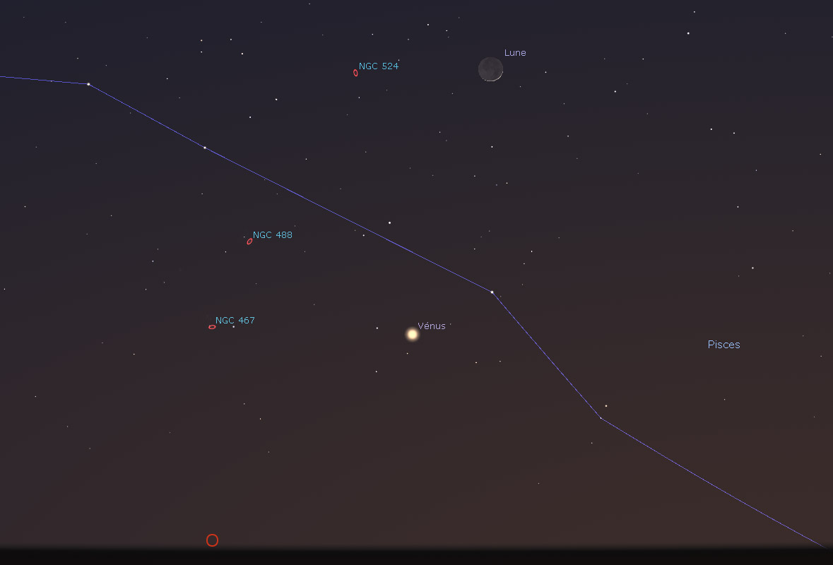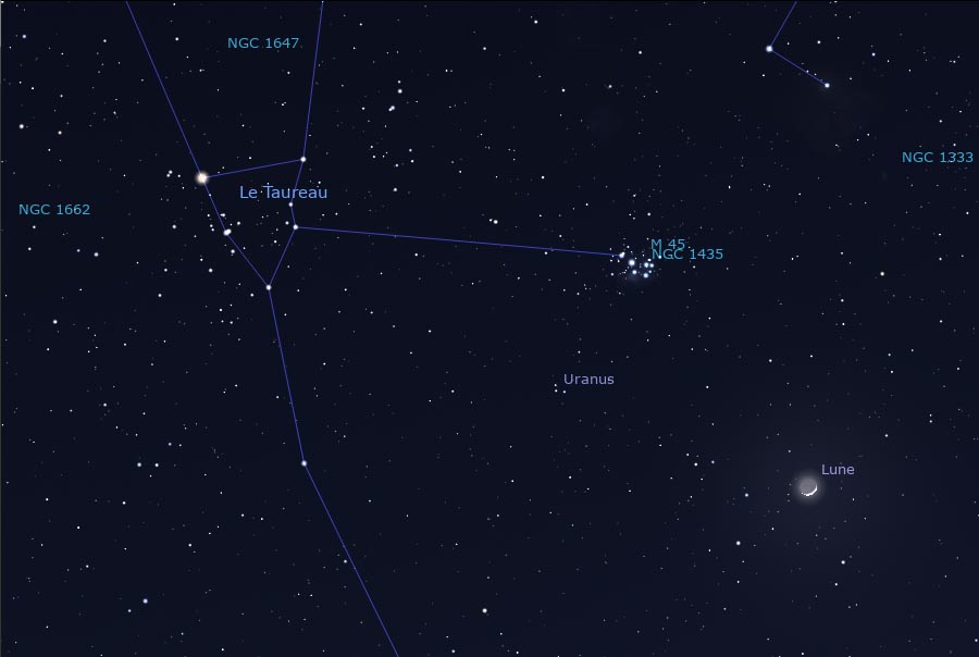Le 22 : Le croissant de Lune sous les Pléïades prés d'Uranus