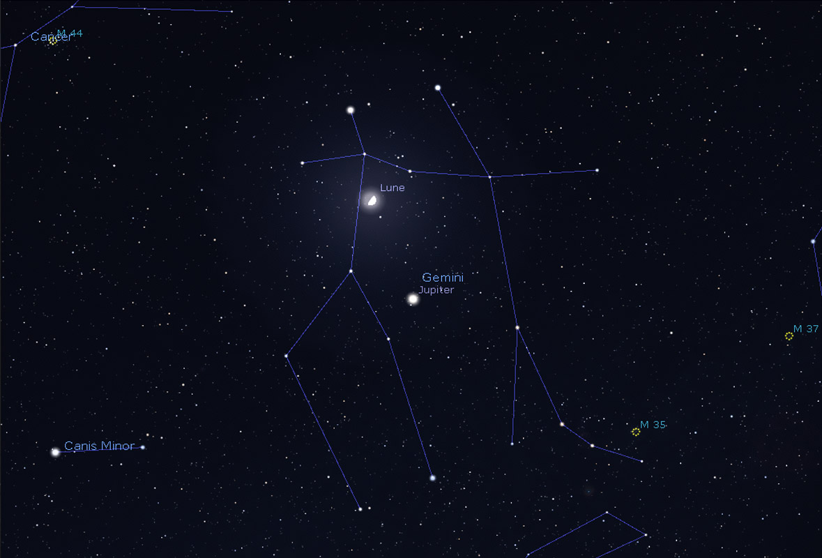 Le soir du 26 : Jupiter près de la Lune dans les Gémeaux
