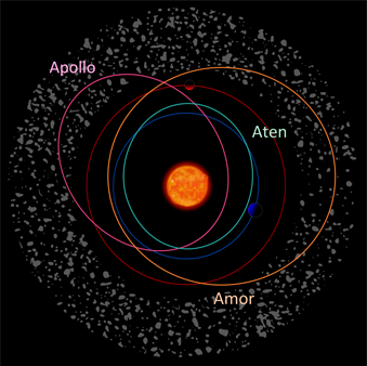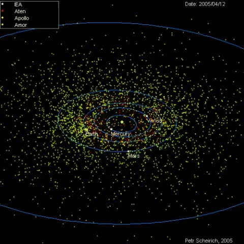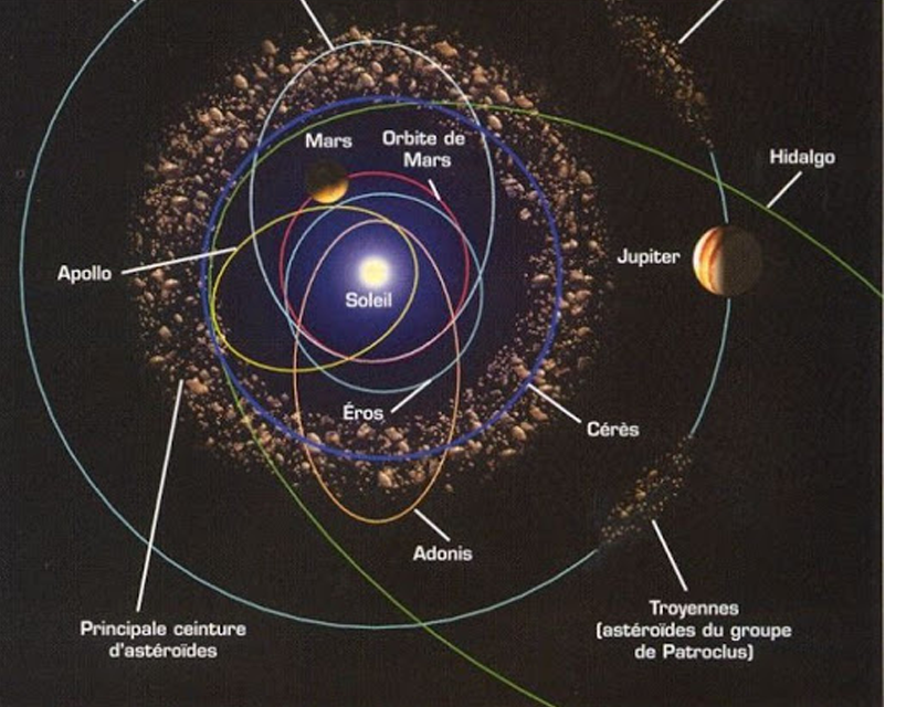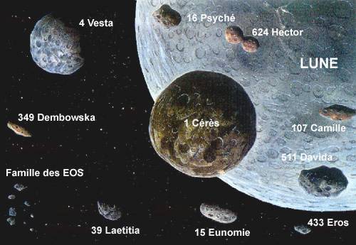 ![]() ![]() ![]() La plupart des astéroïdes se situent entre Mars et Jupiter ( 96% ), leur distance par rapport au soleil est de l'ordre de 2,1 à 3,3 UA, soit entre 315 et 495 millions de kms. C'est la ceinture principale. Cérès, Pallas et Vesta, de diamètres respectifs 933, 523 et 501 km, contiennent la moitié de la masse totale de la ceinture principale. Un millier d'astéroïdes ont un diamètre de 100 km, 200 milliers en ont de plus de 30 km et un million en ont un supérieur à 1 km. Le plus gros astéroïde connu est Cérès et seulement trente astéroïdes on plus de 200 km de diamètre. Position
