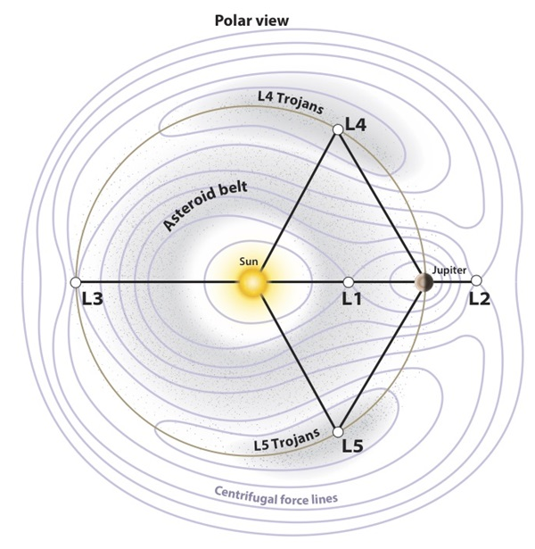 ![]() ![]() ![]() ![]() Chaque planète a un ensemble de cinq points lagrangiens où des objets beaucoup plus petits, tels que les astéroïdes, peuvent maintenir des positions quelque peu stables par rapport au Soleil et à la planète. Les astéroïdes troyens de Jupiter sont divisés en deux groupes principaux. Les astéroïdes du camp grec (menant Jupiter à L4) portent le nom de héros grecs, tandis que ceux du camp troyen (traînant Jupiter à L5) portent le nom de héros troyens Crédits: Institut astronomique de CAS / Petr Scheirich Les Trojans