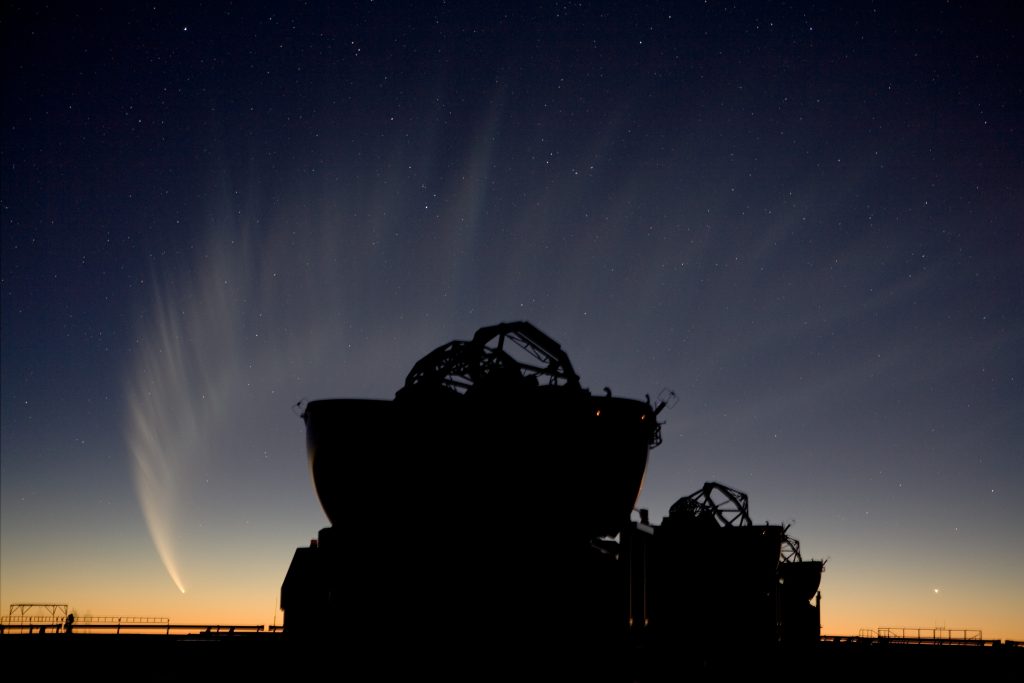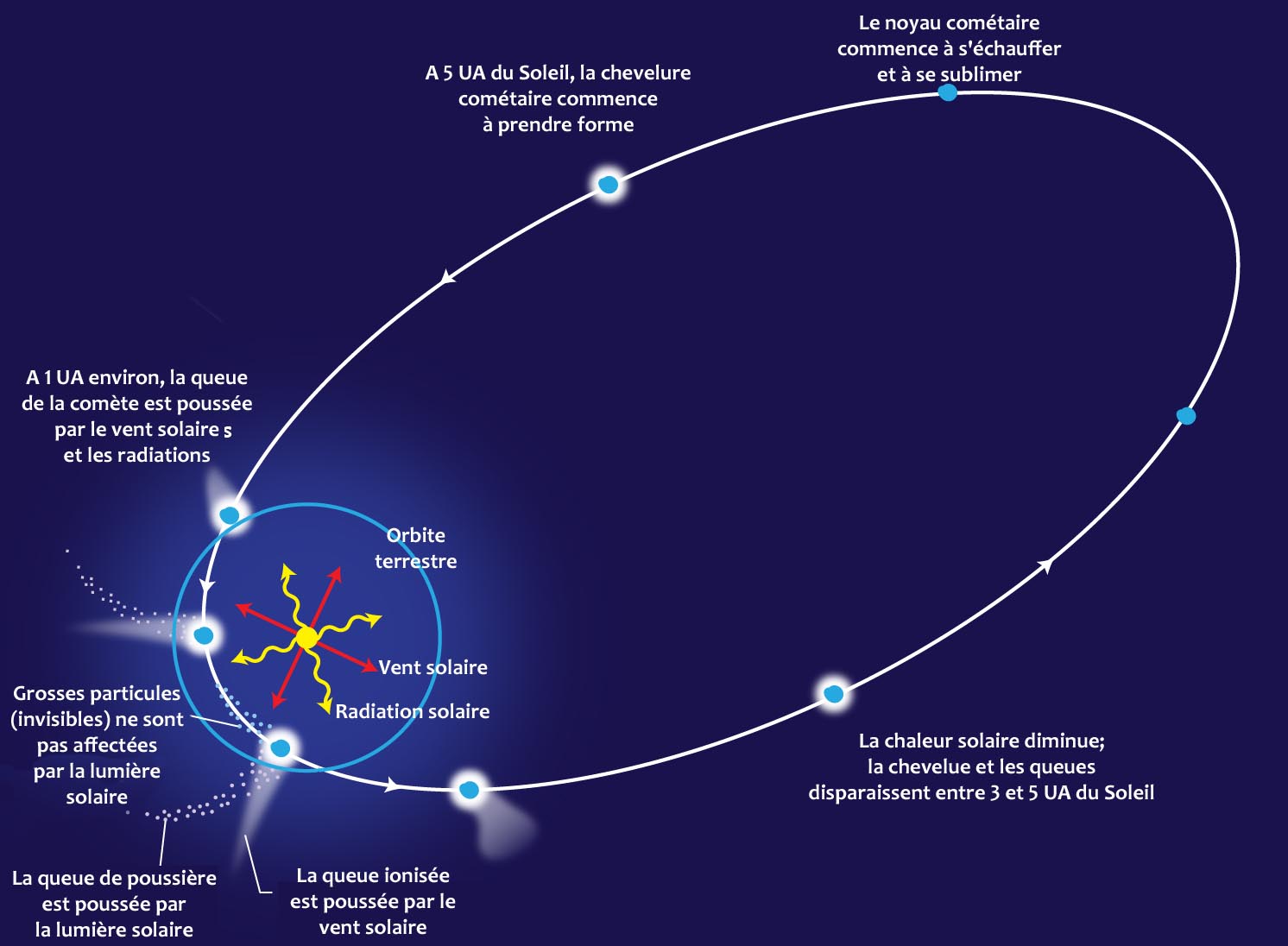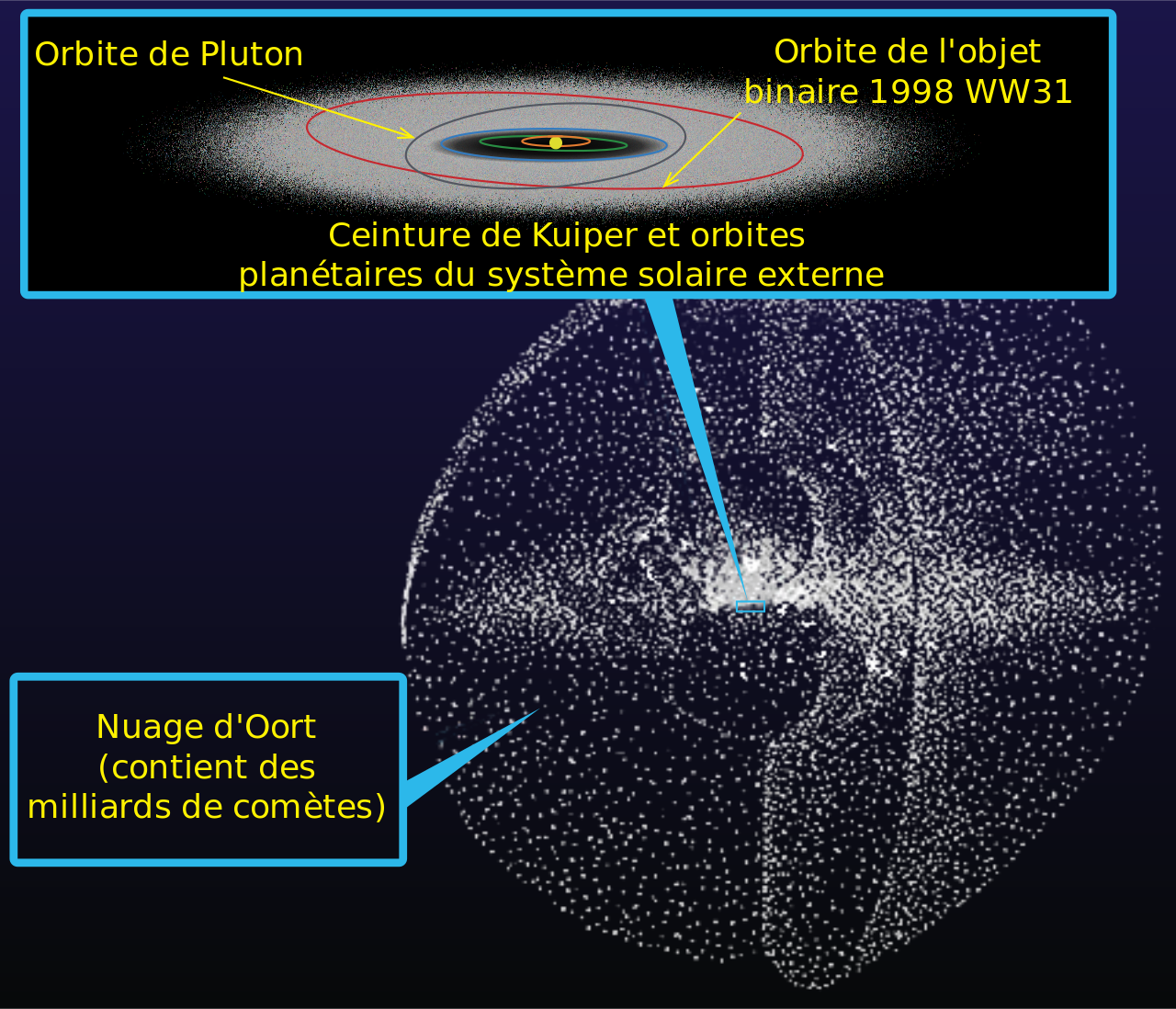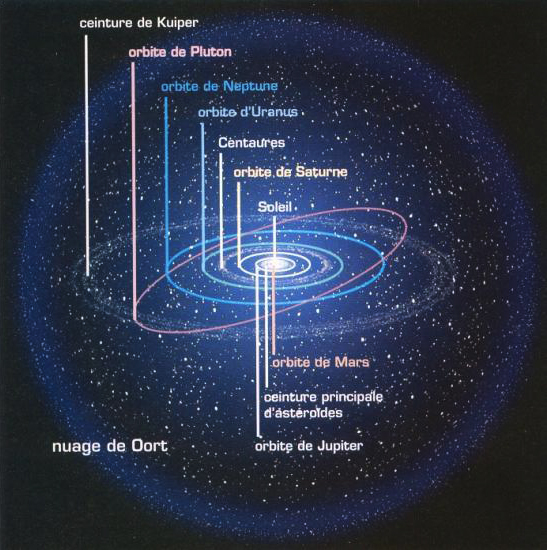 ![]() ![]() ![]() Les comètes viennent de deux régions, la ceinture de Kuiper et le nuage de Oort sutuées au-delà de l'orbite de Pluton. La ceinture de Kuiper, située entre 30 et 100 U.A., soit respectivement 4.5 milliards de kms et 15 milliards de kms du Soleil, contient des centaines de milliers de "cailloux" glacés étant susceptibles de devenir des comètes. Le nuage de Oort situé au-delà de la ceinture de Kuiper s'étend sur 100 000 U.A. soit 15 000 milliards de kms. D'où viennent-elles ?
